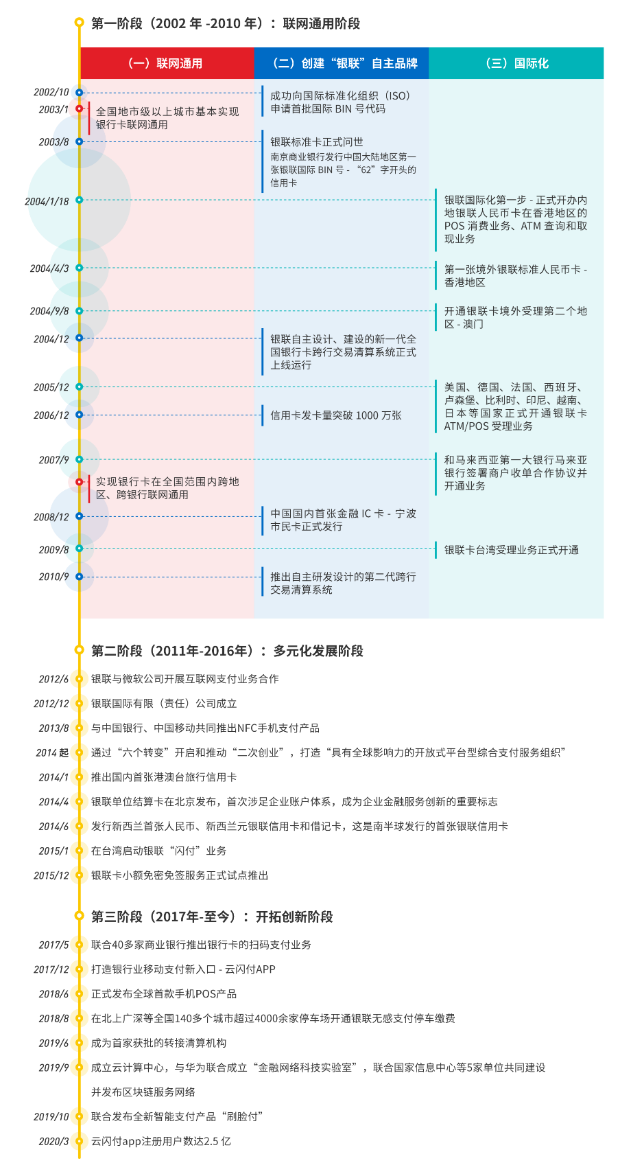 2002年3月,经国务院同意,人民银行批准,中国银联成立,标志着我国银行卡产业开始向集约化、规模化发展,为亿万民众提供了安全、便捷、高效的支付便利,大大提升了中国银行卡产业发展水平。银联成立以后,主要做了三件大事,第一件大事便是联网通用,即建立一个全国性的银行卡跨行信息交换平台,实现银行卡业务联网通用,使得各发卡机构发行的不同标准、不同品牌的银行卡能够相互受理。2002年,在党中央国务院和人民银行的指导下,银联组织各家商业银行,以行政和市场相结合的方式进一步推动联网通用,实现了温家宝总理提出的联网通用“314”目标(即300个城市行内联网通用、100个城市同城跨行通用、40个城市发行银联标识卡并实现异地跨行通用),国内银行卡跨行交易的省际“高速公路”初步搭建起来。2003年1月,全国地市级以上城市基本实现银行卡联网通用。2008年,实现银行卡在全国范围内跨地区、跨银行联网通用。第二件大事是创建“银联”自主品牌,包括创立并推广统一的人民币银行卡标准,自主建成银行卡跨行交易清算系统。2002年10月,银联成功向国际标准化组织(ISO)申请首批国际BIN号代码。2003年8月,南京商业银行发行了中国大陆地区第一张银联国际BIN号--“62”字开头的信用卡,银联标准卡正式问世,填补了国内银行卡市场长期以来无自主品牌卡的空白。2004年12月,银联自主设计、建设的新一代全国银行卡跨行交易清算系统正式上线运行。2006年12月,中国工商银行、中国建设银行、招商银行等相继宣布信用卡发卡量突破1000万张。2008年12月,中国国内首张金融IC卡--宁波市民卡正式发行。2010年9月,银联推出第二代跨行交易清算系统,该系统由中国银联自主研发设计,拥有自主知识产权,交易处理能力和安全性、稳定性均达国际同业领先水平。第三件大事是国际化,2004年起,银联开始实施国际化战略,持续深耕银联全球受理网络建设,不断扩大境外发卡规模和范围,在服务中国人出境用卡的同时,也为越来越多境外持卡人带去了银联卡产品和服务。2004年1月18日,经过人民银行批准,中国银联正式开办内地银联人民币卡在香港地区的POS消费业务、ATM查询和取现业务,迈出了银联国际化的第一步。2004年4月30日,中银香港在香港发行第一张境外银联标准人民币卡,成为银联卡海外发行的开端。2004年9月8日,银联卡在澳门特别行政区的联网业务开通。澳门成为银联卡境外受理的第二个地区。2005年12月,美国、德国、法国、西班牙、卢森堡、比利时、印尼、越南、日本等国家正式开通银联卡ATM/POS受理业务。2007年9月,银联和马来西亚第一大银行马来亚银行签署商户收单合作协议并开通业务。2009年8月,银联卡台湾受理业务正式开通。中国银联的成立,推动中国非现金支付工具跃过纸质支票阶段,直接步入银行卡时代,圆满完成了“联网通用”的历史使命,我国银行卡产业呈现爆发式增长。
